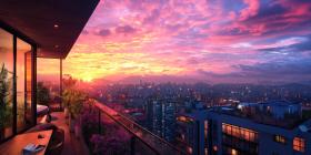Rooftop Balcony with Cityscape View at Sunset, Modern Apartment with Purple and Orange Sky