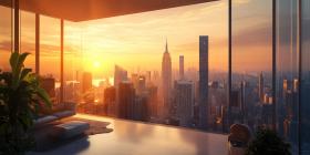 New York City Skyline at Sunset from a High-Rise Apartment with Floor-to-Ceiling Windows