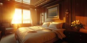 Yacht Bedroom with Sunlit Window, Rich Wood Paneling, and Luxurious Bedding