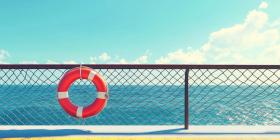 Lifebuoy on a Yacht Railing with Ocean View at Sunset