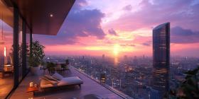 Rooftop Balcony with Cityscape View at Sunset, Modern Apartment with Purple and Orange Sky