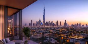 Luxury Apartment with Curved Windows Overlooking a Cityscape at Sunset, Modern Interior Design