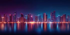 City Skyline at Night with Reflections on Water, Illuminated Buildings and Neon Glow