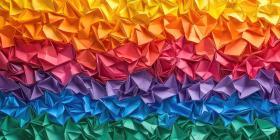 Rainbow Colored Origami Paper: A close-up of folded origami paper in a gradient of rainbow colors, creating a textured pattern.