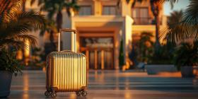 Golden Suitcase in Tropical Setting: A gold-colored suitcase with wheels and a retractable handle stands in a sunny tropical location.