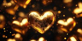 Golden Hearts with Glitter on Dark Background: Two golden hearts and small golden hearts scattered with glitter on a dark surface.