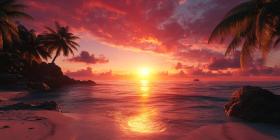 Tropical Sunset Over Ocean with Palm Trees: A vibrant sunset over a calm ocean, framed by palm trees and rocky shore.