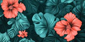 Tropical Bloom: Coral Hibiscus Flowers Amidst Lush, Teal Foliage, A Vibrant Jungle Tapestry of Color and Form.
