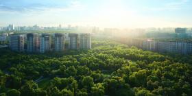 City Park with High-Rise Apartments: A cityscape view of a lush green park with tall apartment buildings in the background, under a bright sky.