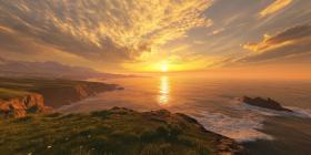 Tropical Sunset Over Ocean with Palm Trees: A vibrant sunset over a calm ocean, framed by palm trees and rocky shore.