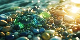 Green Gemstone Among Pebbles: A close-up of a translucent green gemstone resting among wet pebbles on a beach, with sunlight reflecting off the surface.