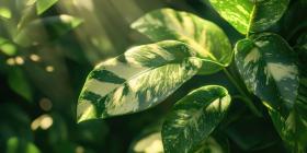 Sunlit Variegated Leaves: Lush Green and Cream Patterns Dance in Gentle Light, a Tropical Garden Embrace.