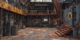 Decaying Industrial Relic: Rust and Shadow Envelop a Forgotten Factory, Whispers of a Bygone Era.