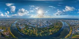 Panoramic Cityscape: River Curves Through Urban Landscape, Sunburst Above, a 360-Degree View of Metropolis and Sky.