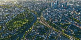 Panoramic Cityscape: River Curves Through Urban Landscape, Sunburst Above, a 360-Degree View of Metropolis and Sky.