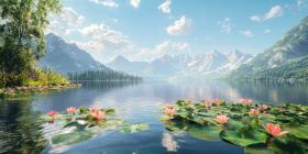 Alpine Lake Serenity: Snow-Capped Peaks Reflect in Calm Waters, Wildflowers Bloom in a Mountain Paradise Under Azure Skies.