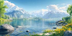 Alpine Lake Serenity: Snow-Capped Peaks Reflect in Calm Waters, Wildflowers Bloom in a Mountain Paradise Under Azure Skies.