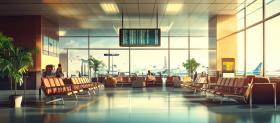 Waiting Area at Airport Terminal, Highlighting Tarmac Views, Flight Information Boards, and Anticipative Travelers