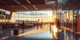 Waiting Area at Airport Terminal, Highlighting Tarmac Views, Flight Information Boards, and Anticipative Travelers