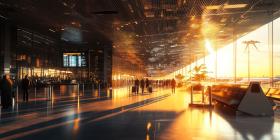 Waiting Area at Airport Terminal, Highlighting Tarmac Views, Flight Information Boards, and Anticipative Travelers