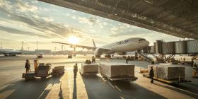 Airport at Golden Hour: Cargo Trucks and Planes in Warm Sunset Glow, a Hub of Global Logistics.