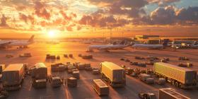 Airport at Golden Hour: Cargo Trucks and Planes in Warm Sunset Glow, a Hub of Global Logistics.