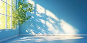 Azure Room Solitude: Sunlight Streams Through Window, Casting Geometric Shadows on Blue Walls and a Glossy Floor.
