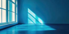 Azure Room Solitude: Sunlight Streams Through Window, Casting Geometric Shadows on Blue Walls and a Glossy Floor.
