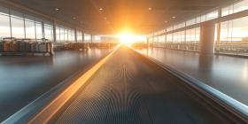 Airport at Golden Hour: Cargo Trucks and Planes in Warm Sunset Glow, a Hub of Global Logistics.