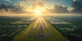 Runway at Sunrise: Airplanes Line Up, Golden Light Bathes the Airport, a Promise of Journeys to Begin.