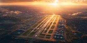 Runway at Sunrise: Airplanes Line Up, Golden Light Bathes the Airport, a Promise of Journeys to Begin.