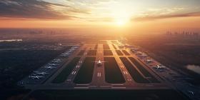 Runway at Sunrise: Airplanes Line Up, Golden Light Bathes the Airport, a Promise of Journeys to Begin.