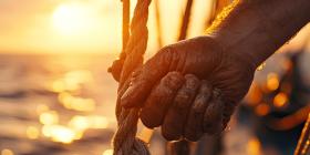 Rugged Hand Gripping Thick Rope: Sunset Illuminating Oceans Texture, Portraying Dedication and Perseverance