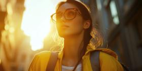 Adventurous Traveler in Straw Hat and Yellow Backpack, Standing Amid Rocky Terrain Under Radiant Sunlight