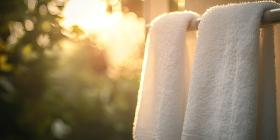 Sunlit Towel Serenity: Soft Fabric Hangs in Golden Morning Light, a Moment of Simple, Warm Comfort.