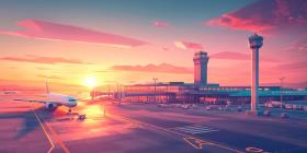 Airport at Dusk: Pink and Orange Skies Frame the Terminal, a Plane Waits, Twilight's Soft Glow on the Tarmac.