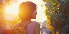 Adventurous Traveler in Straw Hat and Yellow Backpack, Standing Amid Rocky Terrain Under Radiant Sunlight