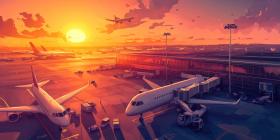 Airport at Dusk: Pink and Orange Skies Frame the Terminal, a Plane Waits, Twilight's Soft Glow on the Tarmac.