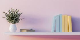 A Simple Shelf Holds Stories and Greenery Against a Softly Lit Pink Wall