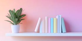 A Simple Shelf Holds Stories and Greenery Against a Softly Lit Pink Wall
