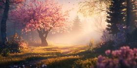 cherry blossom tree forest magical enchanted fantasy spring nature pink flowers leaves sunset sunrise golden hour mist fog dreamy peaceful serene calm tranquil beautiful pretty scenic landscape artwork digital art illustration painting wallpaper background desktop background phone background art artistic image picture visual aesthetic fantasy art whimsical magical forest cherry blossomsSimilar Photos