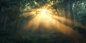 Golden Sunlight Rays Through Rainy Forest: A Mystical Nature Bac