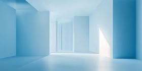 A Long Corridor of Soft Blue Light Beckons the Eye into a Minimalist Architectural Space