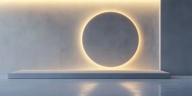 A Glowing Oval Frame Illuminates a Minimalist Platform Against a Textured Grey Wall