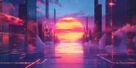 Futuristic Cityscape Sunset: Vibrant Digital Art Background