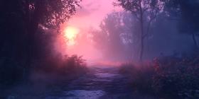 A Misty Path Winds Through a Dreamlike Forest Bathed in the Soft Glow of a Pink Sunset