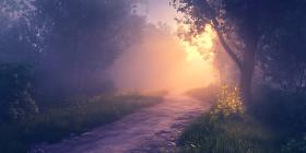 A Misty Path Winds Through a Dreamlike Forest Bathed in the Soft Glow of a Pink Sunset