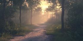 A Misty Path Winds Through a Dreamlike Forest Bathed in the Soft Glow of a Pink Sunset