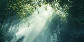 Sunlight Streams Through a Misty Bamboo Forest Creating an Ethereal and Enchanting Atmosphere