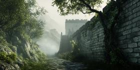 castle forest fog mist mystery ancient stone walls ruins overgrown vegetation trees woods digital painting artwork fantasy landscape scenic nature architecture historical building enigmatic serene ominous path hidden secrets sunlight leaves juxtaposition man-made atmosphere dark light shadow game art digital art illustrationSimilar Photos